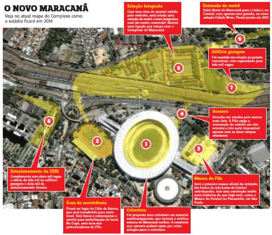 NETVASCO - 27/11/2008 - QUI - 10:49 - Confira o projeto do novo Maracanã para a Copa 2014Está definido o projeto do novo Maracanã, que foi entregue à Fifa no último encontro dos membros do governo carioca com os responsáveis pela escolha das sedes da Copa de 2014 e será referendado em janeiro. O desenho é bem semelhante ao do primeiro projeto conceitual, divulgado pelo governo do Rio em 2007. Mas já apresenta alterações importantes, como a criação do Museu da Fifa, ao lado do Maracanãzinho, no lugar do Parque Aquático Julio Delamare, e uma grande área de convivência, que servirá para revitalização de um dos lados do estádio, hoje tomado por moradores de rua (veja mais nos mapas ao lado).