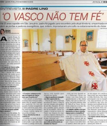 NETVASCO - 27/11/2008 - QUI - 11:46 - Padre Lino: 'Agora, todo mundo quer mandar na Capela'A Capela Nossa Senhora das Vitórias, em São Januário, nunca esteve tão vazia, tão silenciosa. Ao contrário do estacionamento do clube, onde foi improvisado ontem um culto evangélico. A briga da nova administração com a antiga está respingando na religião católica, que perde tanto espaço a ponto de o Padre Lino, capelão de lá há 15 anos, ter denunciado, em entrevista ao ‘Ataque’, que estão puxando o seu tapete.