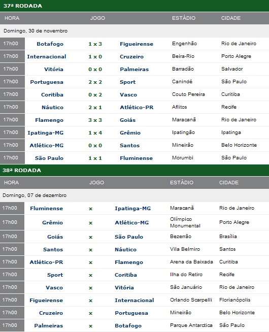 Confira os resultados da 37ª rodada e os jogos da 38ª rodada:
