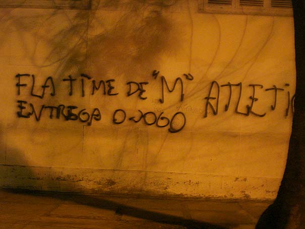 O ato ocorreu por volta de 22h15m e pouco depois o GLOBOESPORTE.COM chegou ao local. Na parede, um recado direto exigindo que o time rubro-negro, chamado de "M", entregue o jogo de domingo contra o Atlético-PR e ajude o Vasco a cair para a Segunda Divisão.
