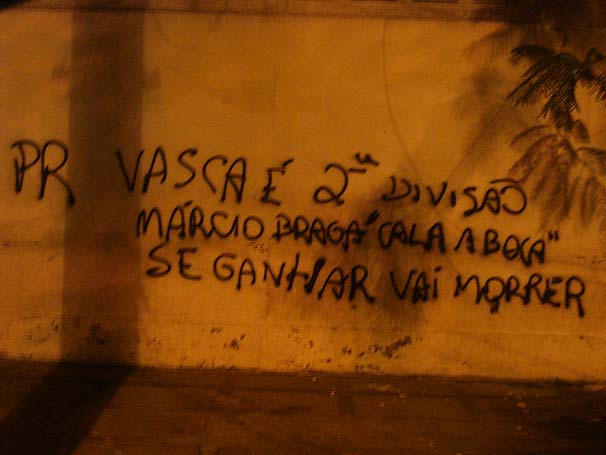 Há também uma frase pedindo para o presidente Marcio Braga "calar a boca". Por fim, uma ameaça: "se ganhar, vai morrer".