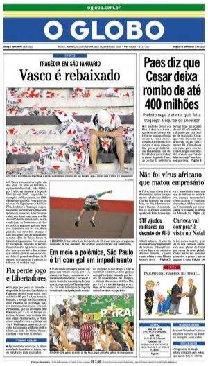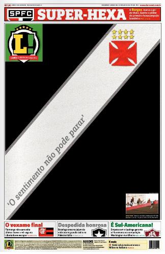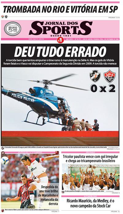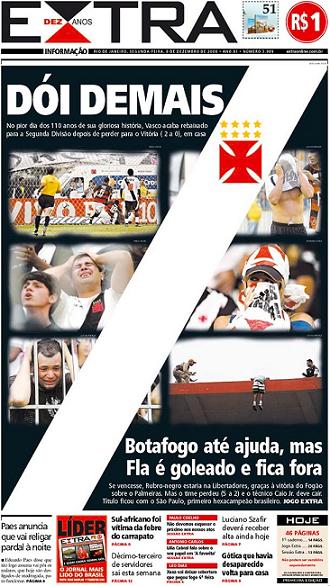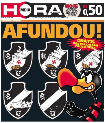 Quatro jornais dedicaram praticamente toda a 1ª página ao descenso do Vasco para a Série B. O Dia, o Extra e o Lance (este último dedicado exclusivamente a esportes) fizeram a linha solidária, mas o Meia Hora, que pertence ao grupo O Dia, partiu para a ironia.