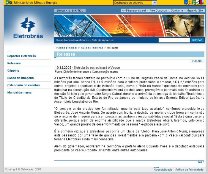NETVASCO - 10/12/2008 - QUA - 20:38 - Site da Eletrobrás: Contrato é de R$ 14 milhões/ano, por 2 anosA Eletrobrás fechou contrato de patrocínio com o Clube de Regatas Vasco da Gama, no valor de R$ 14 milhões por ano, sendo R$ 11,5 milhões para o futebol profissional e amador, e R$ 2,5 milhões para outros projetos esportivos e de inclusão social, como o “Mão na Massa”, que capacita mulheres para trabalhar na construção civil. O patrocínio valerá por dois anos, prorrogáveis por mais dois. O anúncio da decisão foi feito pelo governador Sérgio Cabral, durante a cerimônia de entrega da Medalha Tiradentes e do Título de Cidadão do Estado do Rio de Janeiro ao ministro de Minas e Energia, Edison Lobão, na Assembléia Legislativa do Rio.