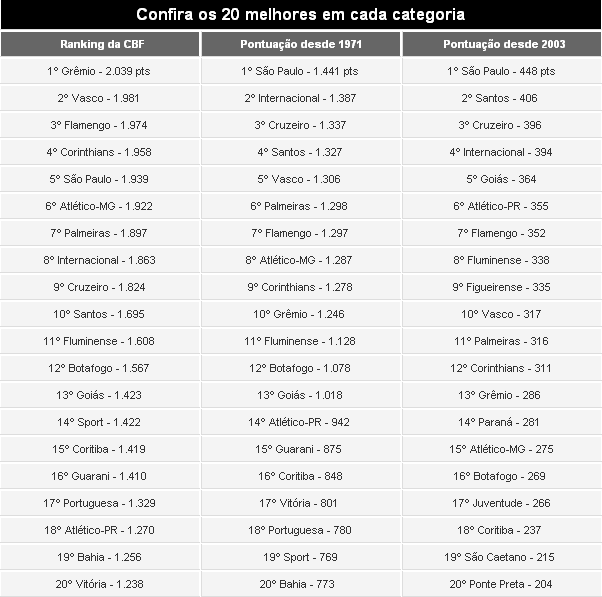 NETVASCO - 11/12/2008 - QUI - 11:47 - Vasco é o 2º colocado no ranking da CBFO GLOBOESPORTE.COM se antecipou à CBF e atualizou o ranking nacional de clubes após a temporada de 2008 no futebol brasileiro. Somente duas competições são levadas em conta no critério de pontuação: a Copa do Brasil e a Série A do Campeonato Brasileiro. Embora hexacampeão há menos de uma semana, o São Paulo é apenas o quinto colocado, atrás de Grêmio, o líder, Vasco, Flamengo e Corinthians. No entanto, o Tricolor Paulista não tem com o que se preocupar quanto à soma da pontuação em todas as edições – e em especial na era dos pontos corridos: não sairá do topo tão cedo (veja nas tabelas abaixo).
