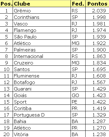 Nota da NETVASCO: Alguns dias atrás, o GloboEsporte.com divulgou um ranking extra-oficial (clique ). Porém, como não computou os pontos dos times das Séries B e C, o ranking não correspondeu à realidade, com o Corinthians atrás do Vasco quando deveria estar à frente. índice | envie por e-mail Anterior: 21:23 - Mandarino deve assumir a vice-presidência de futebol Próxima: 22:33 - Dorival: 'Leandro Amaral seria muito importante para o nosso projeto' |