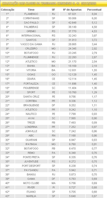 NETVASCO - 13/12/2008 - SÁB - 21:30 - Ranking Timemania: Vasco segue em 8º lugarApós 40 concursos da Timemania, o Vasco segue na 8ª posição, atrás do Santos, que está em 7º, e à frente do Cruzeiro, que está em 9º.