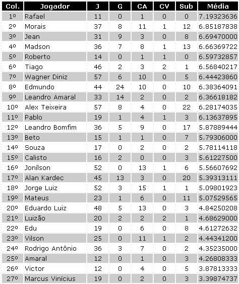 Um total de 116.454 avaliações foram feitas nos 69 jogos oficiais do Vasco na temporada, média superior a 1.600 por partida. Ao todo, 55 jogadores tiveram suas atuações avaliadas pelos freqüentadores da NETVASCO, embora somente os 27 que entraram em campo dez ou mais vezes tenham obtido classificação final.