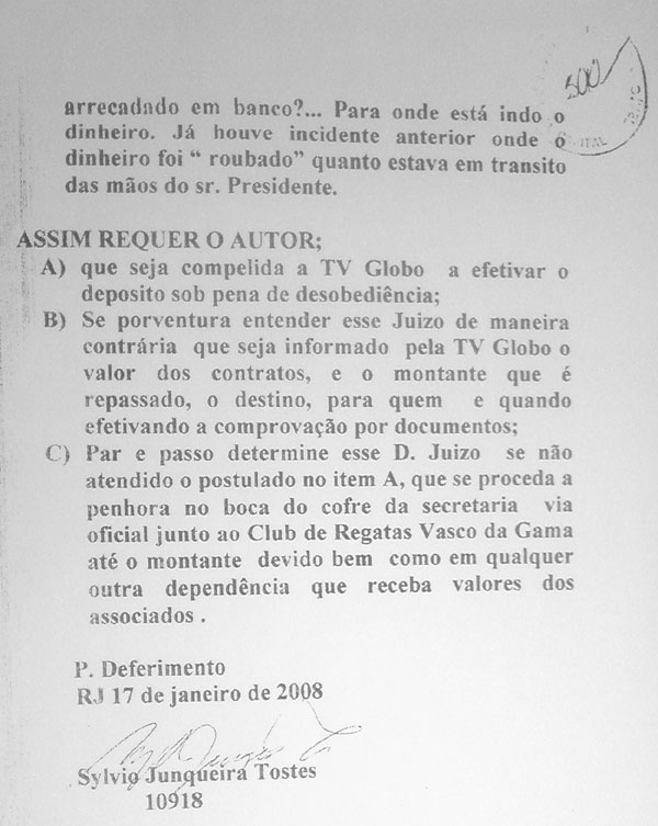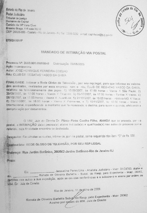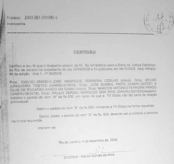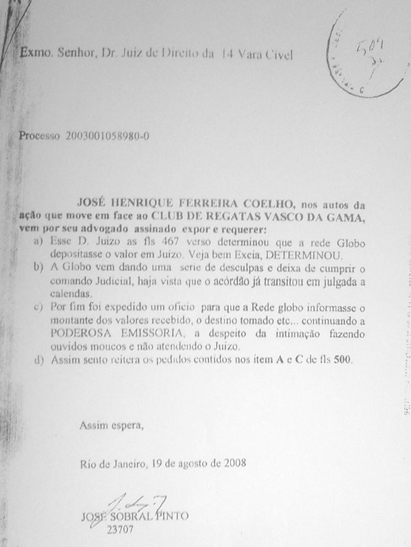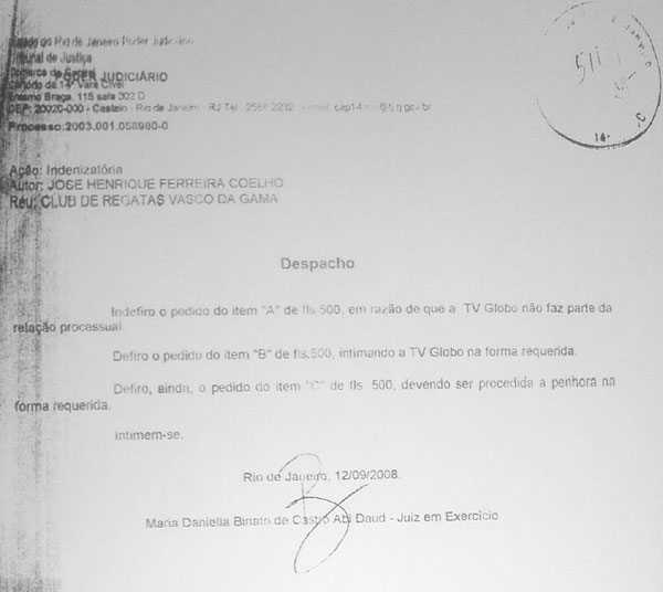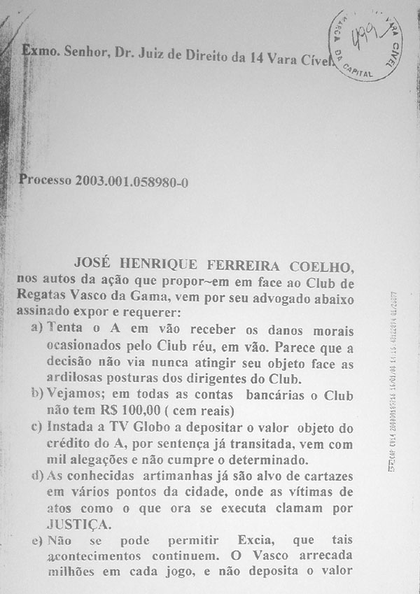 Notem que o processo se originou em 2003, mas José Henrique Coelho, que tomou posse no Vasco no dia 2 de julho 2008, continuou movimentando a ação contra o clube. O exemplo dado por este dito vascaíno serve de referência para toda a nação cruzmaltina, a fim de que saibamos como não se deve agir, quando a questão tratada for o Vasco e o nosso amor a esta gloriosa instituição.