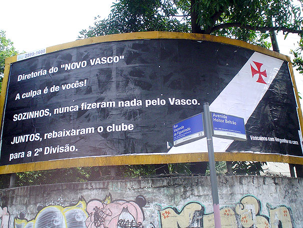 NETVASCO - 20/12/2008 - SÁB - 17:35 - Críticos da gestão Dinamite protestam por intermédio de outdoorTreze dias após o rebaixamento do Vasco para a Série B, críticos da gestão Roberto Dinamite decidiram manifestar publicamente seu descontentamento com a atual diretoria do clube. Por volta do meio-dia deste sábado, um outdoor foi afixado na Avenida Heitor Beltrão, esquina com Rua Visconde de Figueiredo, ponto bastante movimento do bairro da Tijuca (Zona Norte do Rio). O grupo, que se identifica apenas como "Vascaínos com vergonha na cara", atribui a queda do clube para Série B à diretoria do "Novo Vasco". E diz que os grupos que formam a atual administração, quando "sozinhos, nunca fizeram nada" pelo clube. Depois da derrota para o Vitória, Roberto Dinamite responsabilizou o ex-presidente Eurico Miranda pelo mau momento do Vasco, citando a péssima situação financeira em que encontrou o clube em julho.