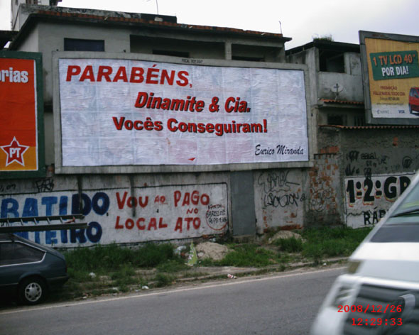 NETVASCO - 26/12/2008 - SEX - 17:27 - Eurico espalha outdoors 'parabenizando' Dinamite por rebaixamentoO ex-presidente do Vasco Eurico Miranda espalhou outdoors pela cidade do Rio de Janeiro com os seguintes dizeres: "PARABÉNS, Dinamite & Cia. Vocês Conseguiram! Eurico Miranda". Os outdoors são em número de 5, mas devem chegar a 40 até o fim do ano. As informações são do site do Casaca, principal movimento de Oposição da política vascaína.