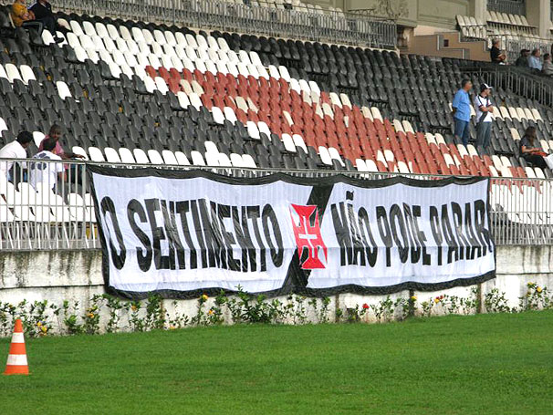 NETVASCO - 05/01/2009 - SEG - 19:27 - Faixa com a frase 'O sentimento não pode parar' é estendida em S. JanuárioPrimeiro dia de treinos no Vasco e os reforços já conheceram o slogan da torcida para a temporada de 2009, em que o clube vai tentar dar a volta por cima e retornar à elite do futebol brasileiro. Uma enorme faixa com a frase "O sentimento não pode parar" foi pendurada nas sociais de São Januário. Alguns jogadores, que realizavam testes físicos, olhavam para a faixa quando passavam correndo perto dela no gramado.