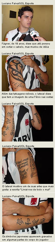 NETVASCO - 05/01/2009 - SEG - 19:55 - Fágner exibe coleção de tatuagens na apresentaçãoNo desfile de novos rostos em São Januário, nesta segunda-feira, um em especial chamou a atenção. O lateral-direito Fágner, que estava no PSV, da Holanda, chegou ao Vasco no melhor estilo fashion. Aos 19 anos, o jogador apareceu com dois brincos brilhantes, um penteado pra lá de estiloso e uma coleção de tatuagens pelo corpo. Ao todo, Fágner tem 11...e destaca que ainda tem espaço para mais algumas.