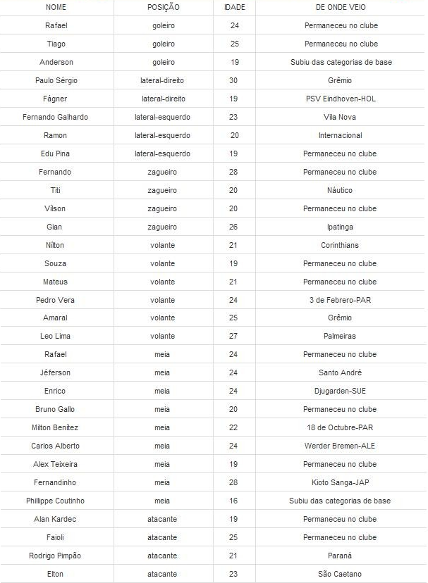 Outro dado curioso do elenco é a faixa etária dos jogadores, provavelmente a mais baixa entre as principais equipes do futebol brasileiro. Hoje, a média de idade do grupo formado pelo técnico Dorival Júnior é de 22 anos e dez meses. E a tendência é que seja assim durante toda a temporada.