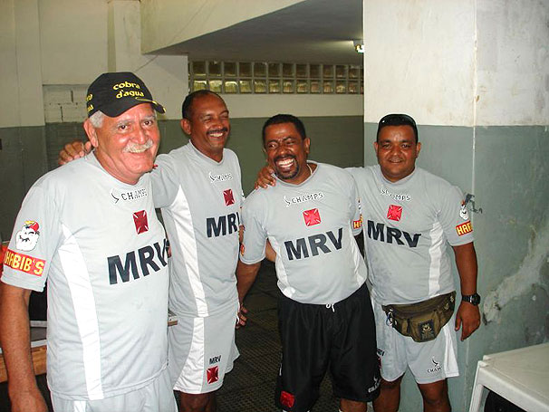 NETVASCO - 19/01/2009 - SEG - 15:59 - Conheça o quarteto responsável pela retaguarda do Vasco em Vila Velha Carlão, Miltinho, Adão e Jérferson são os responsáveis pela retaguarda da delegação vascaína. Os quatro arrumam todo o material que vai ser utilizado pelos jogadores e pela comissão técnica nos treinamentos realizados em Vila Velha, no Espírito Santo. Na foto, o quarteto em um momento de descontração no vestiário do Engenheiro Araripe, em Cariacica.