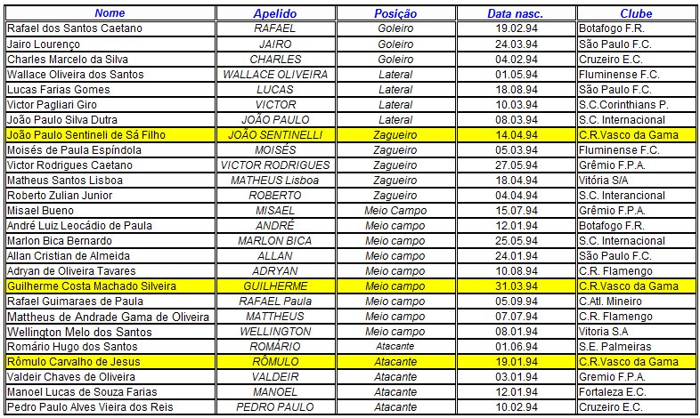 Fonte: CBF News índice | envie por e-mail Anterior: 11:29 - Goleiro Fernando foi apresentado ao Vasco nesta manhã de sexta-feira Próxima: 11:50 - Vasco anuncia campanha de captação de novos sócios para março |