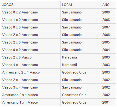 Além da vitória deste sábado, o Americano obteve mais uma em 2003, mesmo ano do título estadual vascaíno. É bem verdade que neste mesmo ano, o time da Cruz de Malta eliminou o adversário nas semifinais da Taça Rio com duas vitórias. Mas nos anos seguintes foram apenas duas vitórias e três empates.