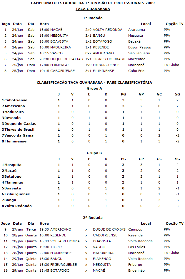 NETVASCO - 25/01/2009 - DOM - 21:11 - Vasco termina 1ª rodada na lanterna do Grupo A da Taça GBTerminada a 1ª rodada da 1ª fase da Taça Guanabara, que equivale ao 1º turno do Estadual 2009, o Vasco figura na lanterna do Grupo A devido aos critérios de desempate.