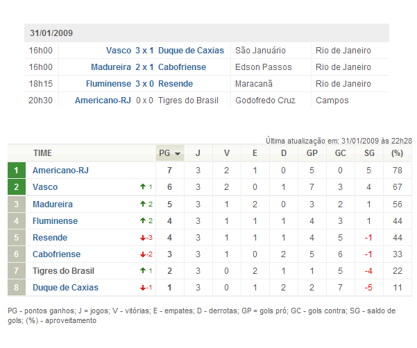 NETVASCO - 31/01/2009 - SÁB - 22:45 - Vasco já é o 2º colocado no Grupo A da Taça GuanabaraO 4 jogos do Grupo A da Taça Guanabara foram realizados neste sábado, 31 de janeiro. O Vasco, que derrotou o Duque de Caxias em casa por 3 a 1, subiu da 3ª para a 2ª colocação, atrás apenas no líder Americano.