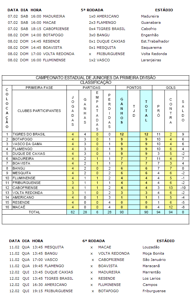NETVASCO - 10/02/2009 - TER - 00:25 - Juniores: Vasco está em 3º lugar no EstadualTerminada a 4ª rodada do 1º turno do Estadual de Juniores, o Vasco está em 3º lugar com 10 pontos. O Tigres (que derrotou o garotada vascaína na estreia) lidera com 12, e o Botafogo está em 2º apenas por ter recebido menos cartões do que o Vasco.