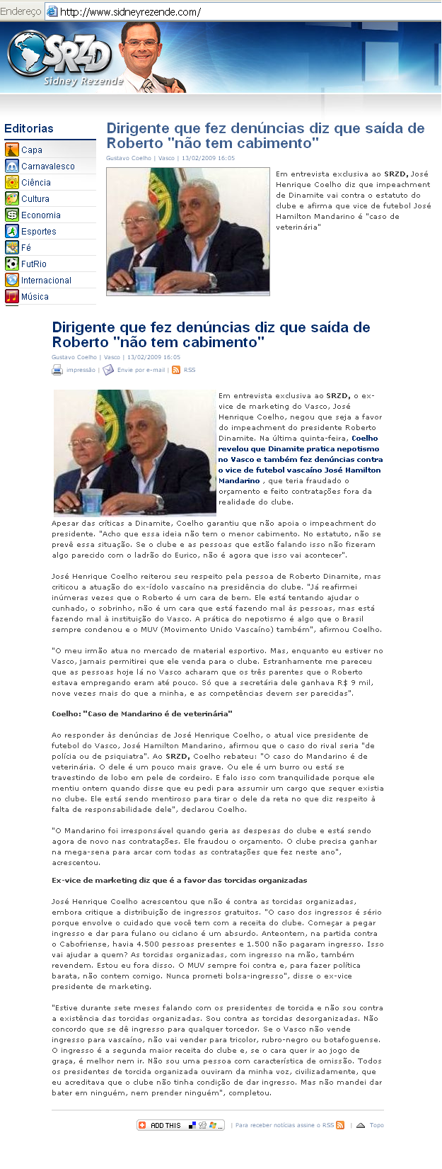 NETVASCO - 13/02/2009 - SEX - 17:33 - Coelho: 'O caso do Mandarino é de veterinária'