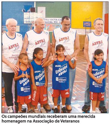 NETVASCO - 18/02/2009 - QUA - 02:29 - Basquete: Edson Bispo e campeões mundiais de 59 homenageados no RioPouco mais de dez dias após a comemoração do cinqüentenário do primeiro título mundial de basquete conquistado pelo Brasil, no Chile, em 1959, as homenagens aos nossos heróis não param. E não poderia ser diferente. Desta vez o evento foi na Praça da Bandeira, Zona Norte do Rio de Janeiro. A Associação de Basquetebol de Veteranos do Rio de Janeiro realizou, em sua sede. uma bela e justíssima festa para os heróis do esporte da bola laranja. Comandado por Benedicto Tortelli, o Paulista, campeão mundial em 1963 e presidente da ABVRJ, o evento contou ainda com a ilustre participação de Wlamir Marques, Amaury, Jatyr e Edson Bispo, além dos familiares dos campeões já falecidos.