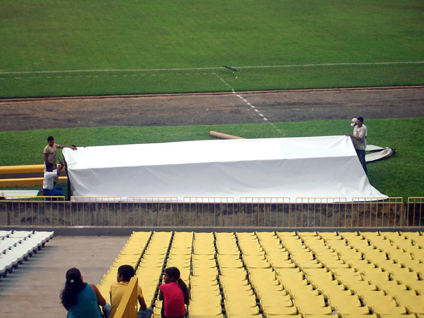 NETVASCO - 18/02/2009 - QUA - 17:24 - Funcionários ajeitam últimos detalhes para Flamengo-PI x VascoFuncionários do estádio Albertão acertam últimos detalhes para o início do confronto entre Vasco e Flamengo-PI, pela primeira fase da Copa do Brasil. Na foto, grupo coloca cobertura do banco de reservas que vai ser utilizado pelo Vasco. Sistema de alto-falantes também é testado pelos organizadores do jogo.