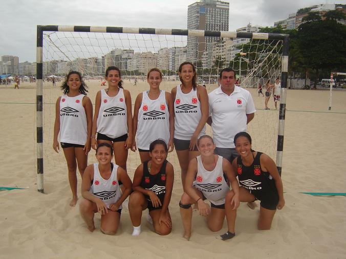 Time de handebol de praia feminino do Vasco. Em pé: Ingrid, Fernanda Pessanha, Amanda, Aline e o treinador Luciano Peçanha. Agachadas: Tatiana, Fabiana, Fernanda Campbell e Karine.
