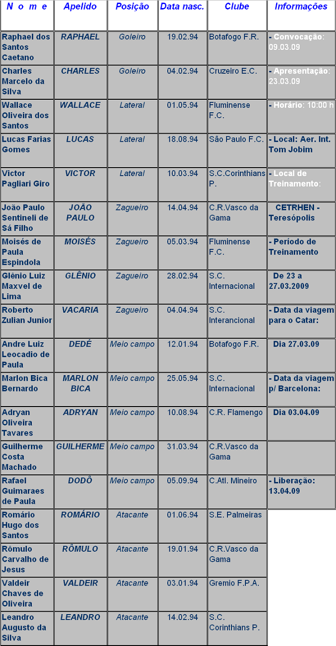 NETVASCO - 09/03/2009 - SEG - 18:53 - João Paulo, Guilherme e Rômulo são convocados para a Seleção Sub-15 O técnico da Seleção Brasileira Sub-15, Leandro Simpson, convocou nesta segunda-feira os jogadores que participarão dos amistosos no Catar e da 9ª Copa Internacional do Mediterrâneo, em Barcelona, que servirão de preparativos para o Sul-Americano da categoria, em data e local ainda a serem confirmados.