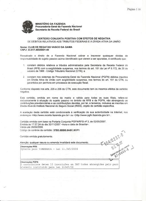 Ficou o Vasco da Gama com sua situação regular perante a Fazenda Nacional, conforme atesta a certidão emitida e discriminada no item 3.