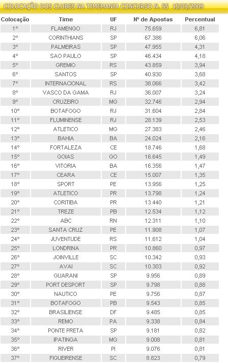 NETVASCO - 21/03/2009 - SÁB - 05:28 - Ranking Timemania: Vasco segue em 8° lugarApós 55 concursos da Timemania, o Vasco segue na 8ª posição, atrás do Internacional, que está em 7º, e à frente do Cruzeiro, que está em 9º.