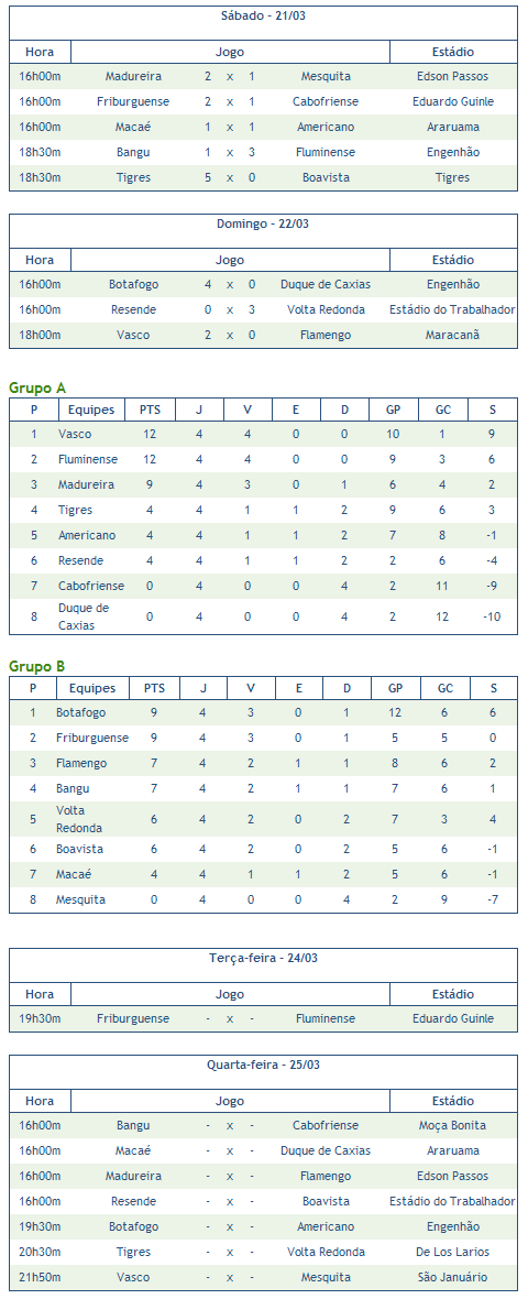Confira os resultados, a classificação e os próximos jogos da Taça Rio:
