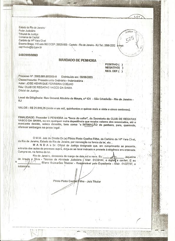 O documento abaixo demonstra um pedido de penhora online realizada pelo sr. José Henrique Coelho contra o Vasco, datada de 10.03.2009. Penhora na “boca do caixa”. O documento fala por si. O sr. Coelho pelo vascaíno de meia tigela que é.
