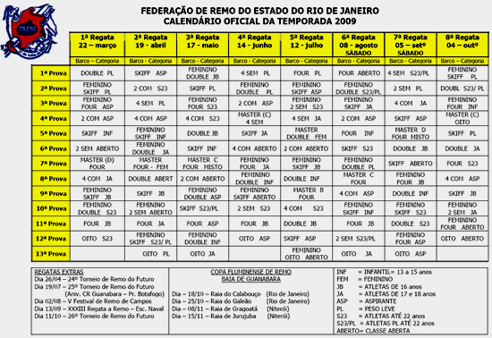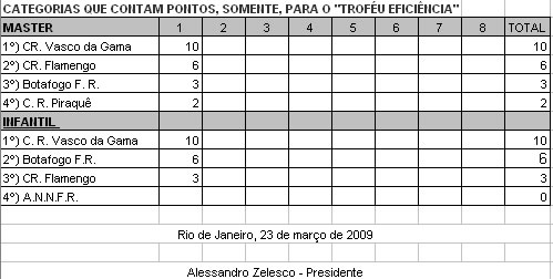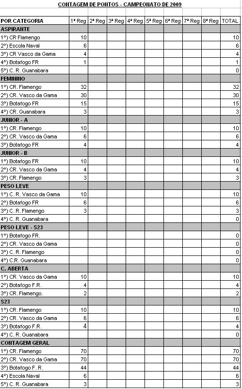 Foi aprovada, pela Comissão de Arbitragem, a 1ª Regata Oficial do Campeonato Estadual, realizada no dia 22 de de 2009, na Lagoa Rodrigo de Freitas cujo o resultado foi o seguinte: