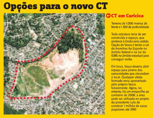 Em 2008, a possibilidade de conseguiar a área era forte, mas, como o Vasco demorou a se mobilizar de verdade, há agora uma dificuldade: o vasto terreno pode fazer parte do plano do presidente Lula de construir 1 milhão de casas populares até 2010.