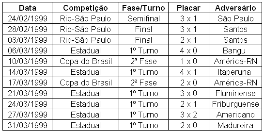 NETVASCO - 05/04/2009 - DOM - 18:10 - Com 10 vitórias seguidas, Vasco iguala série de 1999Com a vitória sobre o Bangu neste domingo, o Vasco chegou a dez triunfos consecutivos em 2009 (um pela Taça Guanabara, um pela Copa do Brasil e oito pela Taça Rio), igualando uma série de 1999 que incluiu a finalíssima do Torneio Rio-São Paulo.