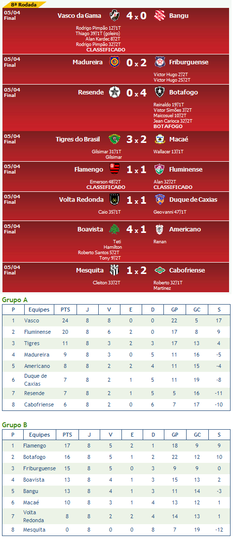NETVASCO - 05/04/2009 - DOM - 18:37 - Vasco termina 1ª fase da Taça Rio com 100% de aproveitamentoO Vasco terminou a 1ª fase da Taça Rio (2º turno do Estadual) com 100% de aproveitamento e em 1º lugar no Grupo A. Desta forma, enfrentará nas semifinais o Botafogo, 2º colocado do Grupo B. O outro confronto será entre Flamengo (1º de B) e Fluminense (2º de A).
