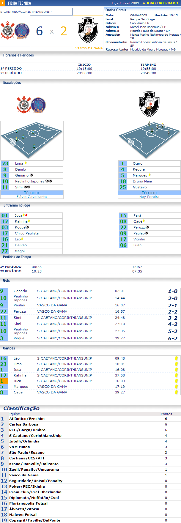 Em seu segundo compromisso na Liga Futsal 2009, o segundo em casa, o S Caetano/CorinthiansUnip (SP) venceu o Vasco da Gama (RJ) na noite desta segunda-feira (6/4), por 6 a 2. Transmitido pelo canal SporTV, o confronto foi realizado no Parque São Jorge, em São Paulo (SP). Com a vitória, o time paulista somou quatro pontos e se manteve invicto na competição nacional deste ano.