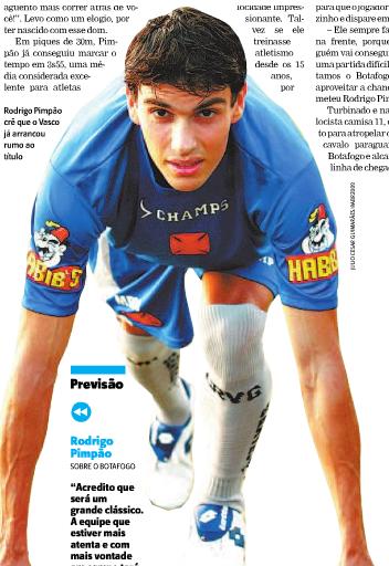 Se depender de velocidade, o Vasco tem em Rodrigo Pimpão a arma ideal para voltar a uma final de turno após cindo anos. Desde o início do Carioca, a velocidade com que o atacante dispara assombra os adversários e até companheiros. Em determinados momentos, Pimpão parece ser apenas um garoto que se diverte ao apostar corrida com os zagueiros. Sai atrás, como quem lhes dá uma vantagem, e teima em chegar na frente para marcar o gol. Mas nada é por acaso. Pimpão nasceu com o dom de ser muito rápido em campo. E vem tirando proveito disso. Aliás, tira até a paciência de alguns adversários: