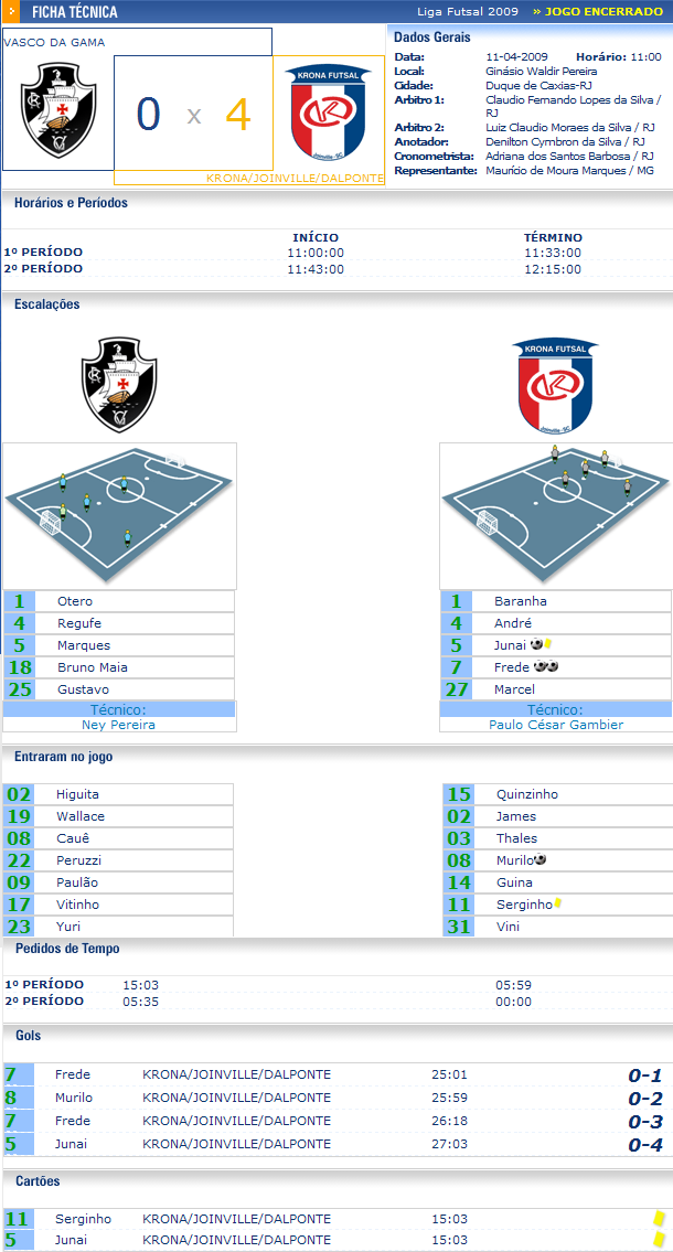 O Krona/Joinville/DalPonte (SC) conseguiu sua segunda vitória na Liga Futsal ao derrotar o Vasco da Gama (RJ) por 4 a 0, na manhã deste sábado (11/4). O confronto ocorreu no Ginásio Waldir Pereira, em Duque de Caxias (RJ). Com mais essa vitória, a equipe joinvillense soma seis pontos em dois jogos, enquanto o Vasco segue com apenas um ponto em três partidas disputadas. Na segunda-feira (13/4), o Vasco faz seu quarto jogo diante do São Paulo/Suzano, novamente em casa. (Nota da NETVASCO: Às 18h15min, com transmissão do Sportv.) Já a equipe catarinense vai a Belo Horizonte (MG) enfrentar a V&M Minas, na terça-feira (14/4).