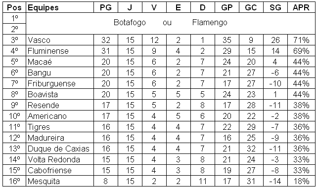 NETVASCO - 12/04/2009 - DOM - 18:53 - Vasco termina Estadual na 3ª colocação, a melhor desde 2004A classificação do Flamengo para decidir a Taça Rio com o Botafogo sacramentou o 3º lugar do Vasco no Campeonato Estadual 2009. Isso porque mesmo que o Botafogo vença a Taça Rio e seja campeão estadual direto, o Flamengo terá assegurado o 2º lugar por ter cumprido campanha melhor que a do Vasco na fase regular dos dois turnos (Taça GB + Taça Rio, excluídos os mata-matas).