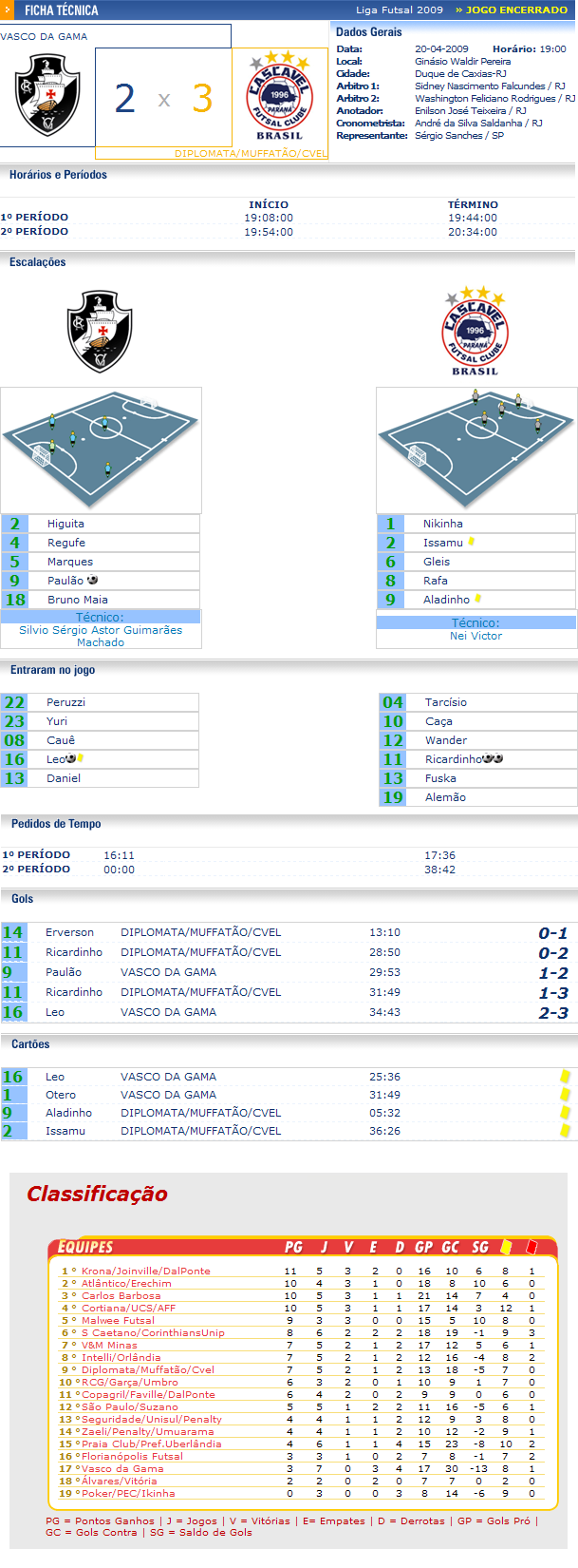 Com uma atuação segura durante todo o jogo, o Diplomata/Muffatão/Cvel bateu o Vasco da Gama fora de casa, pelo placar de 3 a 2, jogando no ginásio Waldir Pereira, em Duque de Caxias, região metropolitana do Rio de Janeiro (RJ), na noite desta segunda-feira (20/4), em confronto válido pela Liga Futsal 2009.