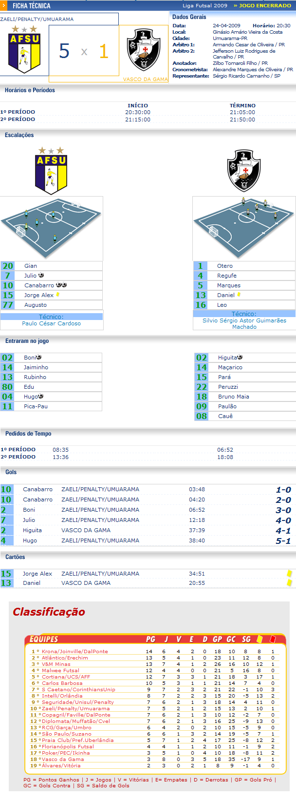 NETVASCO - 24/04/2009 - SEX - 22:42 - Futsal: Pela Liga, Vasco perde para o Umuarama por 5 a 1Com gols no primeiro tempo, o Zaeli/Penalty/Umuarama (PR) venceu o Vasco da Gama (RJ) por 5 a 1, na noite desta sexta-feira (24/4), conquistando mais três pontos na classificação da Liga Futsal. O confronto ocorreu no Ginásio Amário Vieira da Costa, em Umuarama (PR). Com a vitória, a equipe paranaense chegou aos sete pontos, assumindo a nona colocação, enquanto o time carioca segue em penúltimo na tabela, com três pontos em oito jogos.