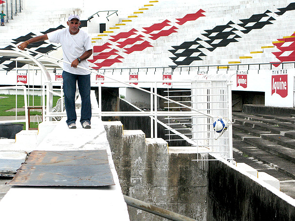 NETVASCO - 04/05/2009 - SEG - 17:26 - No Arruda, funcionário do Santa Cruz ajuda a pegar bolas que caem no fossoNo treino do Vasco desta segunda-feira, no estádio do Arruda, no Recife, algumas bolas caíram no fosso que circula o gramado. Um funcionário do Santa Cruz foi logo avisando que não havia problema. Ele foi até um canto do gramado e pegou um instrumento feito especialmente para buscar as bolas. Sem muito esforço, ele ia tirando uma a uma e devolvendo ao gramado.