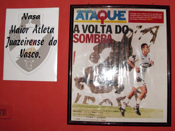 NETVASCO - 06/05/2009 - QUA - 18:01 - Nasa é homenageado no vestiário do estádio RomeirãoO ex-volante vascaíno Nasa é realmente uma celebridade em Juazeiro do Norte. Em um dos vestiários do estádio Romeirão, palco da partida desta quarta-feira entre Icasa e Vasco, há uma homenagem para o ex-jogador. Além de um quadro com uma enorme capa de um jornal carioca sobre o ex-volante, há também uma mensagem colada na parede: 'Nasa, maior atleta juazeirense do Vasco'.