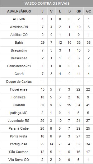 Contra o Bahia, um adversário tradicional da Série A ao longo da história, o Vasco fez 29 jogos, com só sete vitórias, 12 empates e dez derrotas. Outro rival que normalmente o clube carioca enfrenta na elite do futebol brasileiro é o Guarani. A desvantagem no duelo é grande: em 30 jogos no Brasileirão foram nove vitórias, seis empates e 15 derrotas.