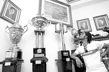 Ele olha para o fundo da sala e vê um enorme corredor repleto de medalhas e taças. Ali se conta uma história gloriosa.