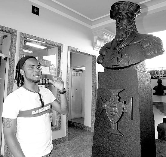 Saindo da sala de troféus, Carlos Alberto vê o busto do navegador Vasco da Gama: