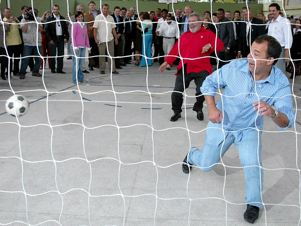 Durante a inauguração do Complexo Poliesportivo em Manguinhos, na Zona Norte da cidade do Rio de Janeiro, o presidente Luiz Inácio Lula da Silva e o governador do Estado do Rio, Sérgio Cabral, simularam uma disputa de pênaltis. A brincadeira entre as autoridades pode ser uma prévia do que pode acontecer na próxima quarta-feira, quando o Corinthians, de Lula, recebe o Vasco, de Cabral, no Pacaembu, no jogo de volta das semifinais da Copa do Brasil. Em caso de novo empate por 1 a 1 entre as equipes, a disputa da vaga nas finais será em cobranças de penalidades. O Timão se classifica em caso de vitória ou empate sem gols. Os cruzmaltinos precisam vencer ou empatar a partir de 2 a 2 na capital paulista.