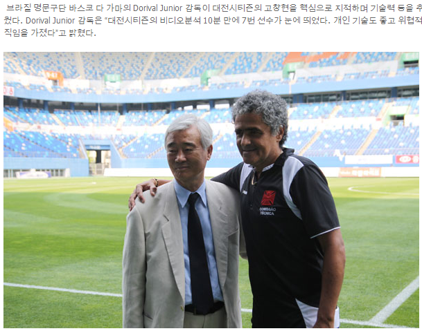 O site oficial do Daejeon Citizen, time coreano que o Expressinho do Vasco enfrenta ŕs 7h deste sábado (30/05) na Coreia do Sul, em amistoso, cometeu uma gafe: chamou o treinador Gaúcho (nesta foto ao lado de Kim Ho, treinador do time anfitriăo) de Dorival Júnior (link ). Confira: