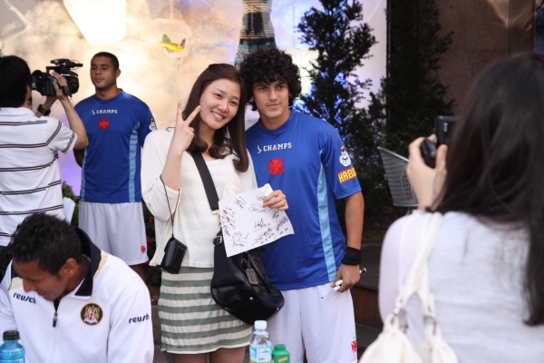 Milton Benítez faz a alegria da fã coreana; Faioli, ao fundo, fala para a TV local